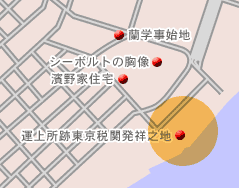 1823年(文政6年)に長崎に到着したオランダの商館医員フィリップ・フランツ・フォン・シーボルトは、その後江戸にやってきて日本橋の長崎屋に止宿し、江戸の蘭学者に面接指導し大きな影響を与えた。この地は江戸蘭学発祥の地である事と、シーボルトが長崎でもうけた娘が築地に産院を開業したことから、あかつき公園内に胸像が建てられた。 |
