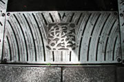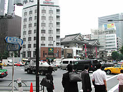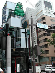 銀座4丁目交番の建物の上へ視線を上げていくと……、親子と思われる2匹の「安全カエル」の姿が。にっこり笑顔で、仲良く、まちを見守っています。 |