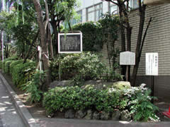 生け垣には三十間堀の石垣に関する区の説明板があります |