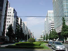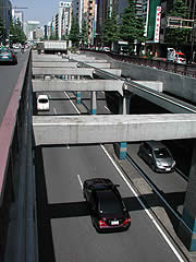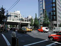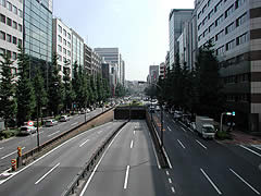昭和通りを歩いていると度々出くわす三十間堀。その歴史の始まりは江戸時代にまでさかのぼります。堀が開削されたのは江戸初期の慶長17年(1612年)のこと。船入堀(船を入れるための人造の港)を整備するために、幕府が西国の大名に作らせました。幅が三十間(約54.5m)あったことからその名が付けられたそうです。ちなみに付近の昭和通りの幅員は44m。昭和通りより広い堀だったようです。 |