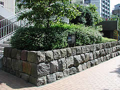 新京橋交差点を右折し、京橋プラザへ近づくと、プラザの脇に立派な石垣があります。この石垣には、三十間堀の護岸跡から発掘された石が使われているそうです。