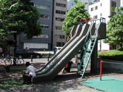 「おもしろ発見 その2」の生け垣の隣に、コンクリート製の素朴なすべり台の姿が…。すべり台があるのは、京橋プラザ隣の京橋公園内。このすべり台は、大正12年の関東大震災後の復興整備の際に京橋公園と一緒に造られた代物。すべり台としては、区内で唯一現存する、貴重な復興の証、もちろん今も現役です。