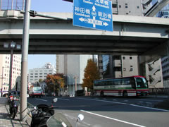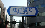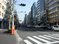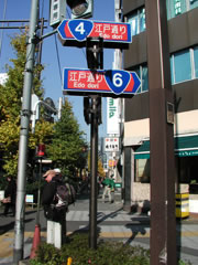 本町3丁目交差点で、江戸通りが2つの国道に属することを示す道路標示を発見!室町3丁目交差点から本町3丁目交差点までは国道4号と国道6号の重複区間。国道4号は江戸通りから昭和通りへと続いて、青森県青森市へと至ります。また、国道6号は室町3丁目交差点以東の江戸通りを経て、茨城県水戸市を通り、宮城県仙台市へと至ります。 |