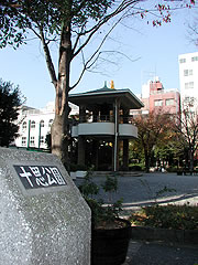 二代将軍秀忠のとき、この場所(当時は日本橋石町)には江戸時代で最初となる「時の鐘」が設置されていました。鐘は江戸城内西の丸から移設されたもので、宝永8年(1711年)に鋳造されたものといわれています。昭和5年に再建され、現在は日本橋小伝馬町の十思公園内に納められています。ちなみに、当時の江戸市中には、日本橋石町のほかに、浅草、上野、本所、市ヶ谷、目黒、赤坂、四谷などにも時の鐘があったそうです。