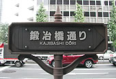 通りの名前は、鍛冶橋交差点のすぐ西に戦後まであった鍛冶橋に由来しています。鍛冶橋交差点には鍛冶橋跡を記した説明板があります。それによると、現在の鍛冶橋交差点とJR線の間には江戸城の外濠があり、鍛冶橋が架けられ、同橋の先に江戸城の外郭門の一つ鍛冶橋御門があったそうです。「鍛冶」という名前の由来は、橋の東側にあった南鍛冶町(現在の八重洲2丁目あたり)に由来していると考えられています(門と橋の歴史については「(1)鍛冶橋交差点」へ)。