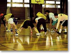 現在団員数は、小中高と成人の男女で30名以上います。お伺いした日は、3名のコーチとともに父兄も参加して楽しんでいらっしゃいました。 |