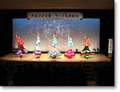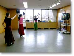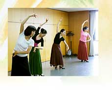 自ら編集したビデオで柔軟体操を行い、ステップの練習に3時間近くを占められていました。時折、聞きなれないスペイン語が飛び交ったり、両手に持つカスタネットの練習にも余念がありません。つま先やかかとで床を踏み鳴らしてリズムをとり、手の動きのしなやかさで心を表現するのがフラメンコの醍醐味です。踊り手とギタリスト、歌い手の呼吸に合わせながら、甲高い音と低くこもった音の二種類の音を使い分け、手拍子を叩いていきます。観客側から見るとメリハリや小気味良い駆け引きがあって、それもフラメンコの魅力の一つだと思います。足さばきと床を踏み鳴らす音は、スペインの人たちの情熱的な国民性を表すようで、見ている人を魅了します。 |