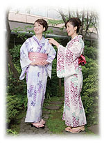 衣裳協力:源氏物語・堀井 着付協力:花影きもの塾 ファッションポイント 2008年のゆかたは白やベージュの地色、涼やかな花柄が主流で和風のベーシックな本物志向が静かな人気を呼びはじめています。 (右)のゆかたは藤の花がやさしい印象。本染め特有の味わいが引き立ちます。花と同系色の半幅帯で女性らしさをアップ。 (左)のゆかたも同様に人気の藤の花がモチーフに。淡い色使いが涼感を与えます。ピンクの兵庫帯をあわせて優雅で上品なイメージに。 |