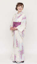 素肌に羽織る浴衣は遊び着の定番ですが、半襟を付け、レースの足袋を履くなど着物風に…コーディネイト次第では街着としても通用します。「藤の裏葉」の模様の「日本橋美人ゆかた」に、紫の帯を合わせて華やかながらもしっとりと。小物使いで涼やかさを演出しています。 着付け:花影きもの塾 衣装協力:源氏物語 堀井株式会社 撮影協力:ロイヤルパークホテル 撮 影:吉川信之 |
