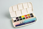 呉竹の『フェイス透明水彩セット』は高品質な固形透明水彩絵の具14色と、便利な水筆ぺん、ドローイングペンがコンパクトにまとまっています。絵の具の顔料が均一で色を混ぜても濁らず、携帯しやすいサイズです。散歩や旅行のお供にいかがですか。
